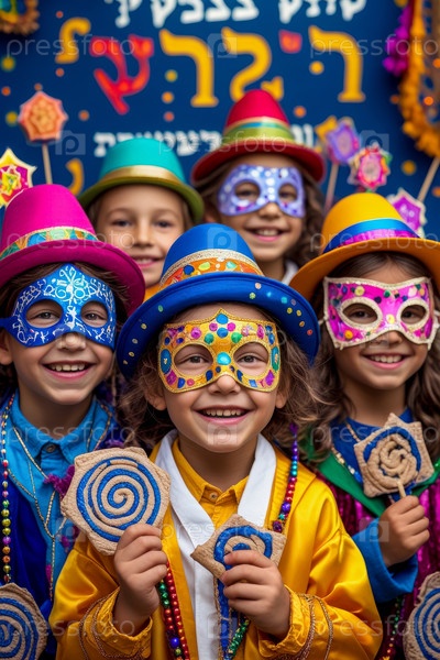 Еврейские дети в карнавальных костюмах празднуют традиционный еврейский праздник Пурим Израиль AI Generative