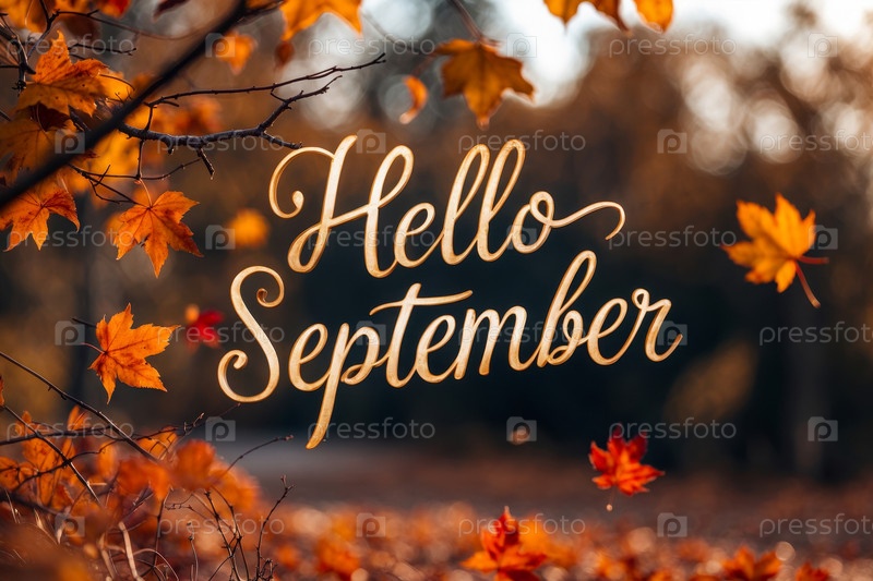 Карточная надпись Привет сентябрь осень-осень фон желтый красный листья лист осенний AI Generative
