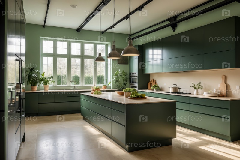 AI Generative Современный стильный модный кухонный интерьер с зеленой мебелью и предметами домашнего обихода