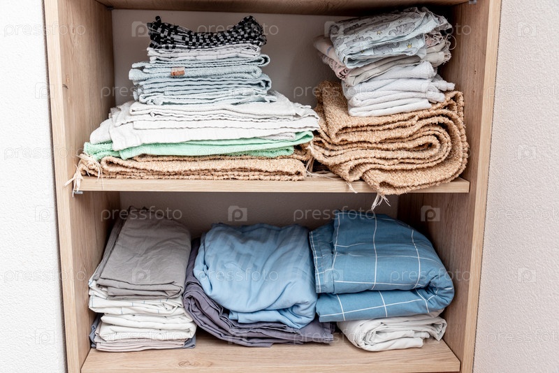 Постельное белье, простыни и подушечные чехлы и полотенца аккуратно уложены в шкафу в спальне