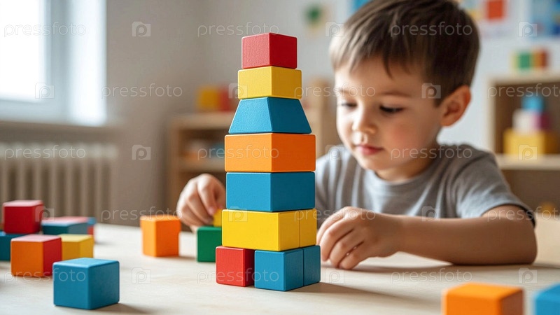 Ребенок из конструктора, деревянных деталей строит башню. Ребенок играет за столом. Мальчик собирает башню из деревянных кубиков