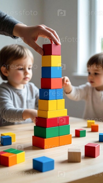 Ребенок из конструктора, деревянных деталей строит башню. Ребенок играет за столом. Мальчик собирает башню из деревянных кубиков