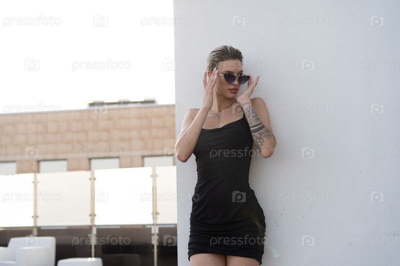 Молодая красивая женщина позирует в черном коротком платье в студии