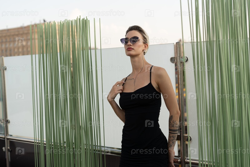 Молодая красивая женщина позирует в черном коротком платье в студии