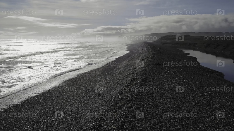 Океанские волны разбиваются на черном песчаном пляже
