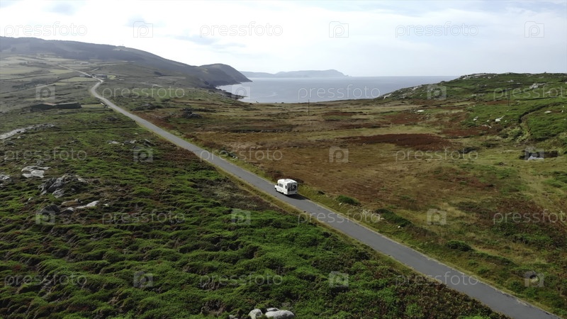 Белый трейлер едет по живописной прибрежной дороге.СМИ