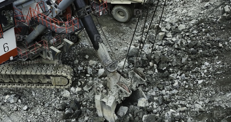 Экскаватор собирает камни в карьерной добыче