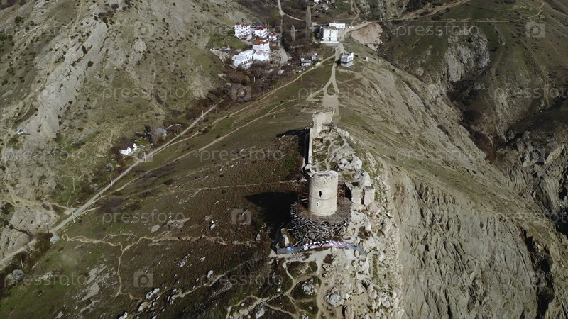 Вид с воздуха на руины древней генуэзской крепости с видом на залив Балаклава.Медиа