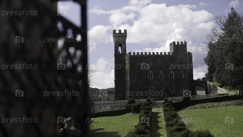 Средневековый замок, виденный через кованые железные ворота в итальянской деревне