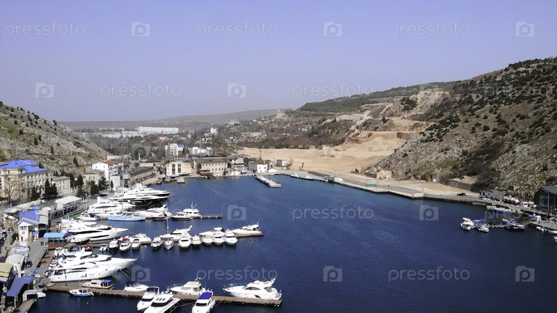 Вид с воздуха, летящий над роскошными яхтами, пришвартованными в заливе Балаклава, Крым