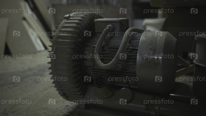 Промышленный мотор с изношенным корпусом, изношенным мотором и настройкой передач на полу мастерской среди запутанных проводов