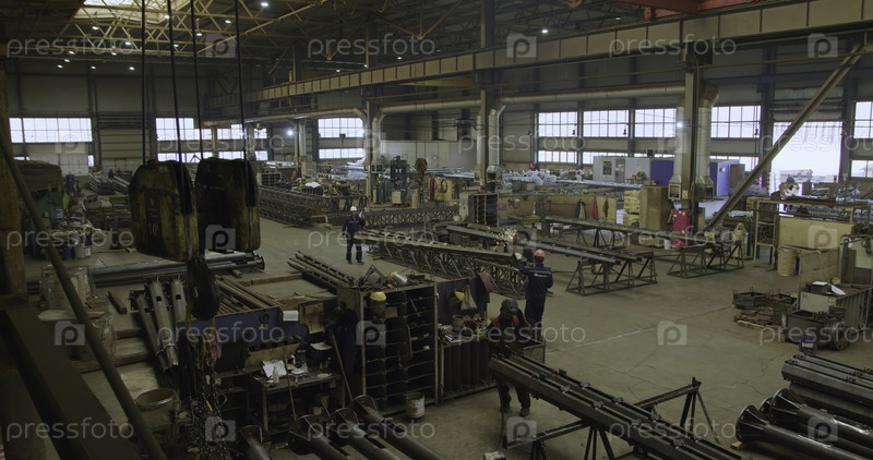 Сцена изображает оживленный склад, наполненный рабочими, активно занимающимися различными металлическими изготовлениями и сварными задачами