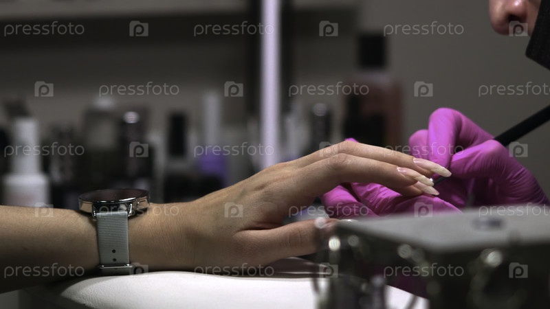 Окружающая среда для ухода за ногтями, профессиональная процедура маникюра с техником и клиентами на аккуратной рабочей станции