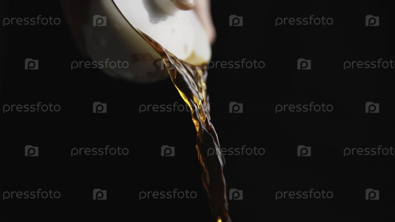 На этом изображении показана рука, наливающая темную жидкость из белой чашки на богатый темный фон для подчеркивания