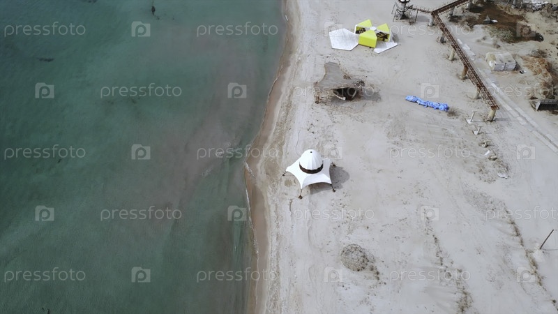 Вид с воздуха на строительство музыкального фестиваля на песчаном пляже