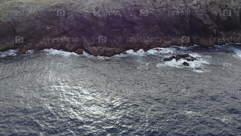 Вид с воздуха, летящий над морем и скалистыми утесами, раскрывающими маяк