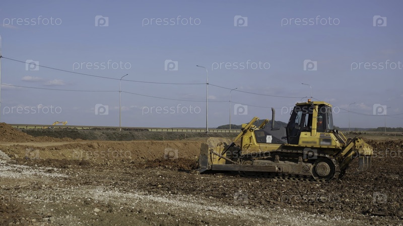 Желтый бульдозер выровняет землю на строительной площадке