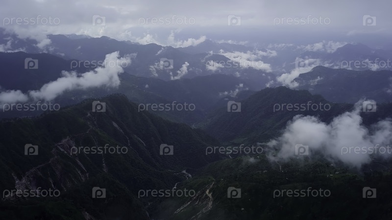 Спокойный и потрясающий горный пейзаж с туманом и облаками над горизонтом