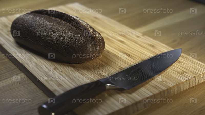 Удаление хлеба и дамасского ножа с бамбуковой режущей доски.СМИ