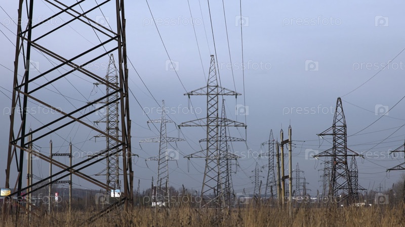 Высоковольтные линии электропередачи и башни передач ландшафт. СМИ