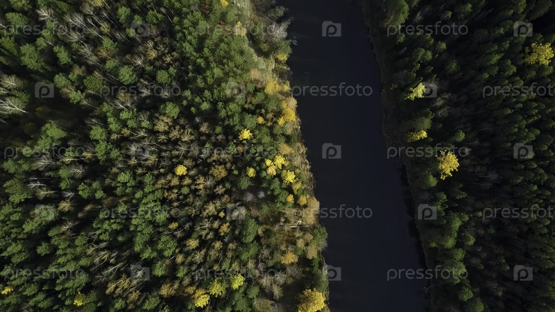 Абсолютно потрясающая перспектива с воздуха, демонстрирующая спокойную и тихую реку, облицованную яркой зеленью