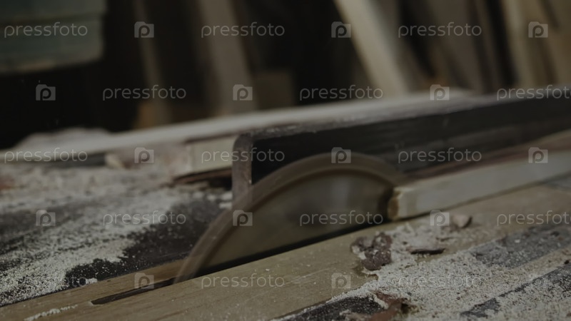 Семинарная сцена с вращающейся пилой в движении, плотник готовит древесину, когда лезвие быстро перерезает