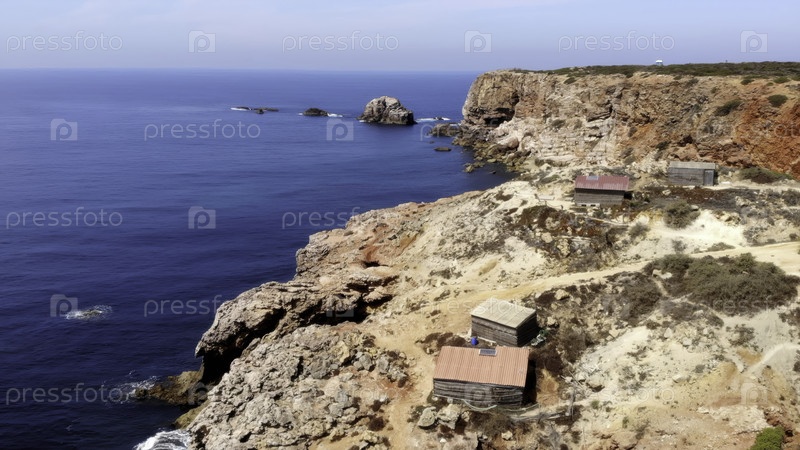 Скрытый морской домик, установленный на резких красных скалах с лицом к мирным бирюзовым водам для путешествий