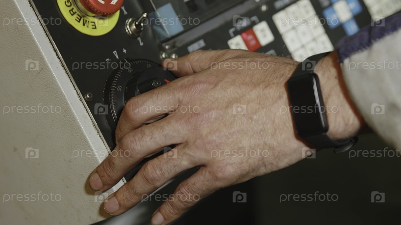 Подробный ближайший вид руки, умело управляющей панелью управления на сложных промышленных машинах