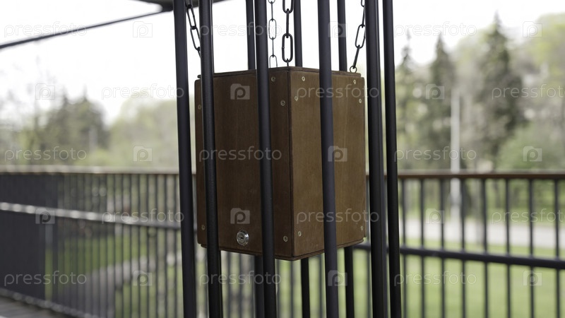 Загадочная деревянная коробка висит на металлическом заборе и клетке на балконе, смешивая природу с городскими элементами, вызывая любопытство