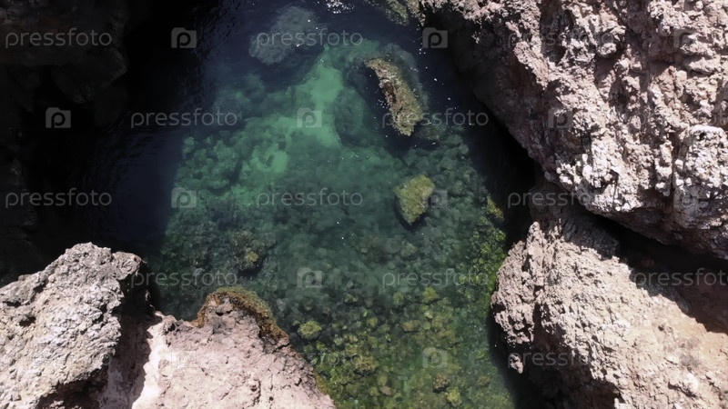 Потрясающий взгляд с воздуха, великолепный высокогорный снимок тихого лазурьевого залива в окружении скалистых холмов