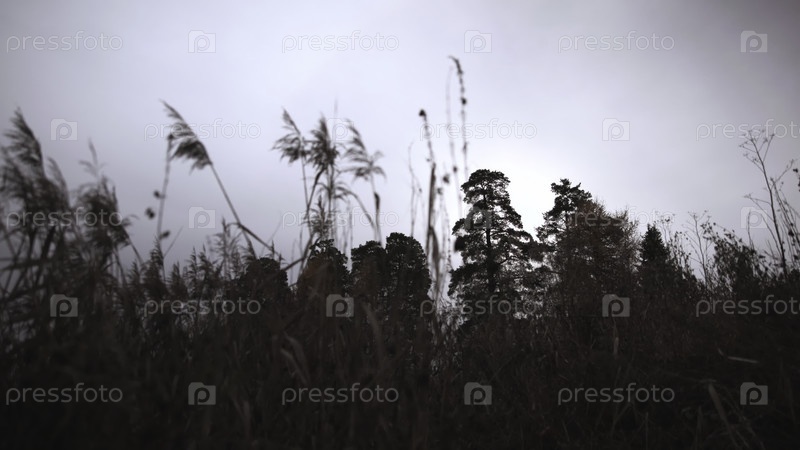 Увлекательная сцена болота с далекими деревьями, спокойный силуэт болотного джунгля под облачным вечерним небом
