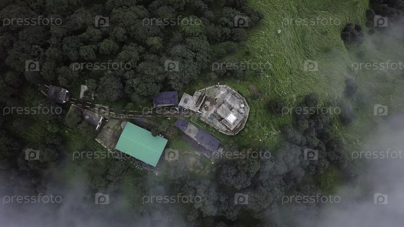 Потрясающий взгляд с воздуха на мирный пейзаж со строениями, расположенными в горах