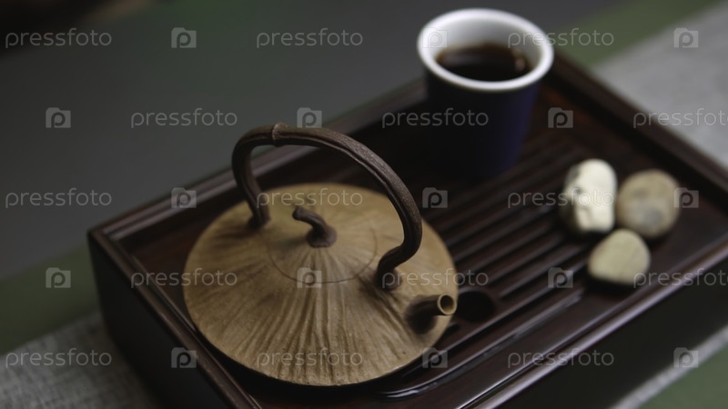 Спокойная чайная конфигурация с изготовленным глиняным чайником, соответствующей чашей и декоративными камнями на деревянной подносе