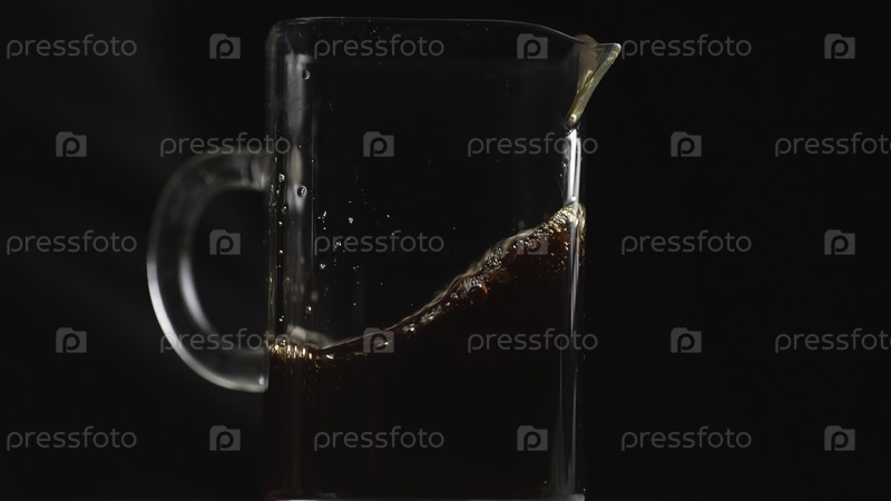 Стеклянный кувшин, заполненный завариваемым кофе, демонстрирующий богатые цвета и пузыри на темном фоне