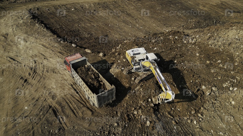 Экскаватор загружает самосвалы на стройплощадке
