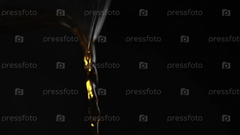 Ближайшее изображение яркой жидкости, разливающейся, образуя сложные формы и потрясающие отражения на темном фоне