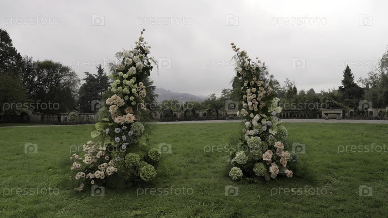 Свадебная церемония цветочные аранжировки, мягко качающиеся на ветре в саду