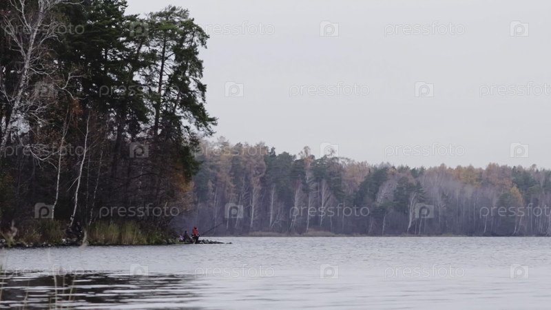 Рыбак по береговой линии, тихая наружная обстановка с рыболовом рядом с туманными скалами возле леса