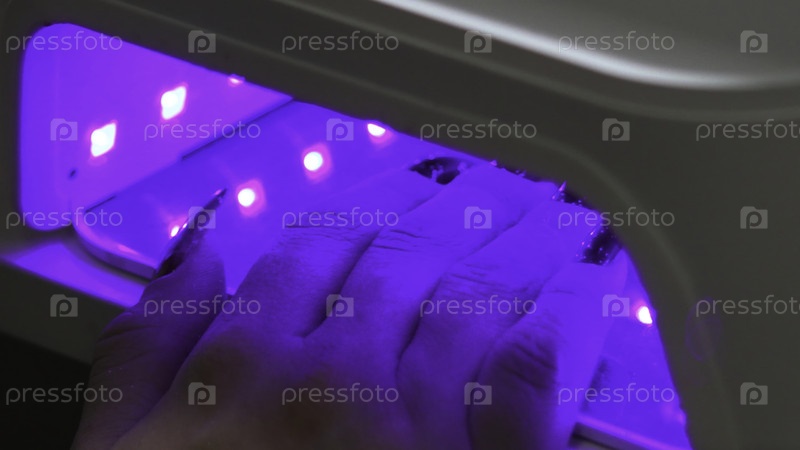 Процесс отверждения ногтей фиолетовым светом, лак для ногтей закаливается ультрафиолетовым светом в салоне