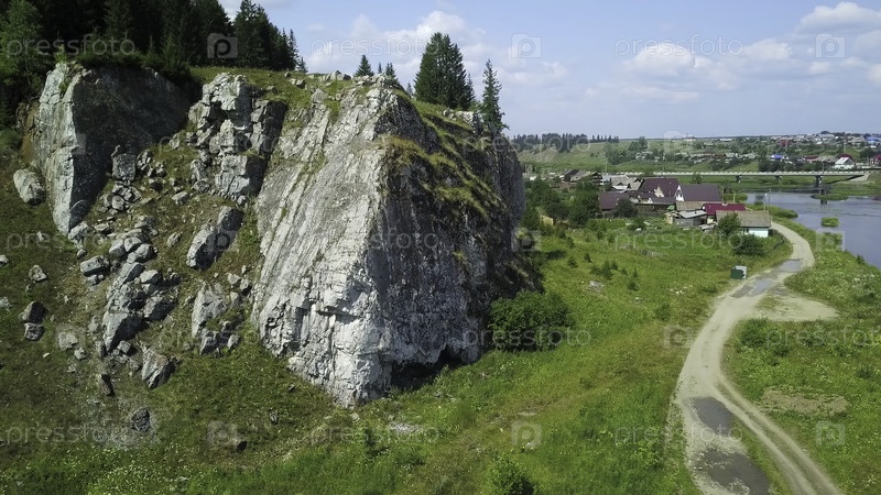 Потрясающий и захватывающий вид на скалистую скалу, расположенную рядом с спокойной рекой в окружении пышного зелени