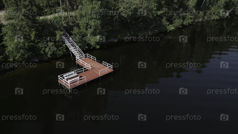 Спокойный и спокойный док, расположенный на тихом озере, которое красиво обнимается пышной зеленой природой