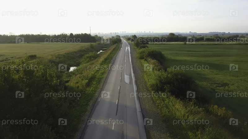 Вид с воздуха сельской дороги через зеленые поля