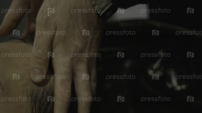 Профессиональный парикмахер моет мужской волосы в раковине салона