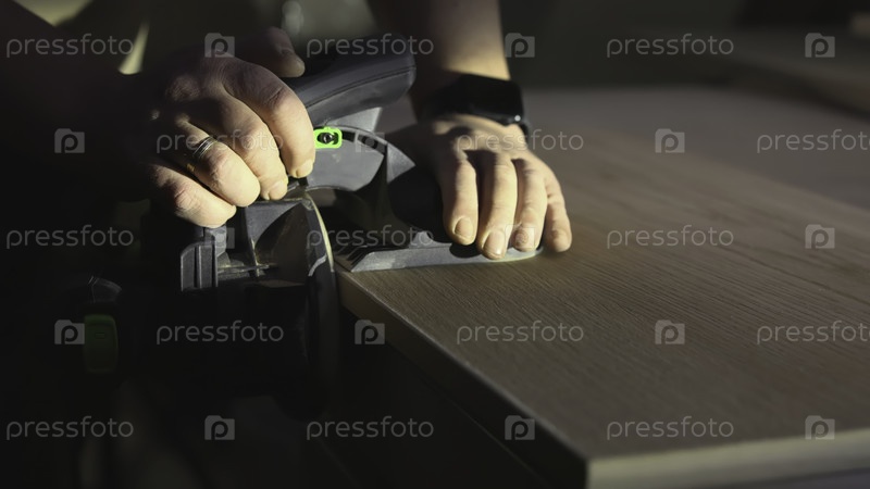 Ремесленник тщательно очищает деревянную поверхность с помощью мощных инструментов в теплом освещении мастерской
