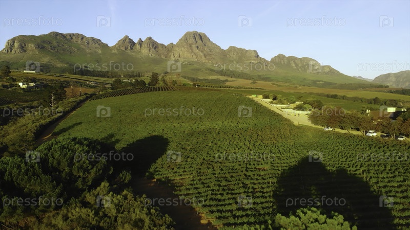 Подсвеченный дроном, бросающий тень через виноградник, дрон плавает над пышным виноградником во время заката солнца