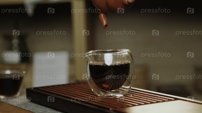 Это видео демонстрирует спокойный момент приготовления напитка, в котором чайник наливает чай в стеклянную чашку и уютная сцена с кофе