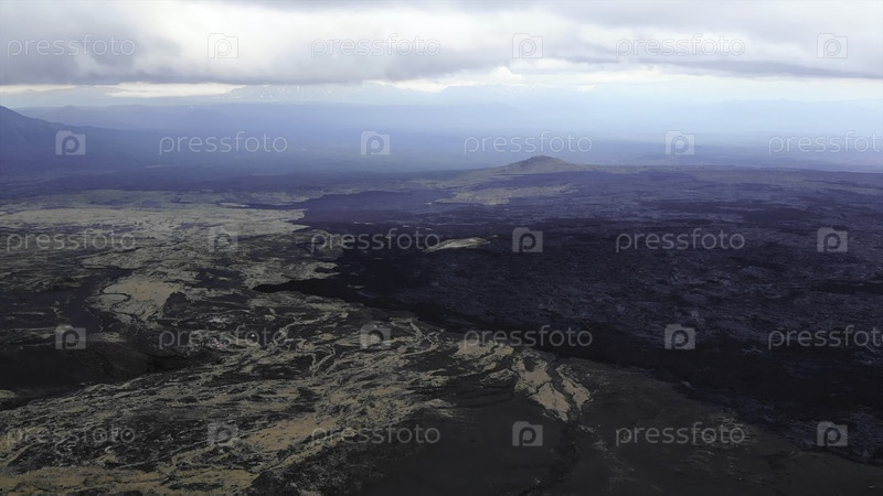 Вид с воздуха, летящий над вулканическим ландшафтом и полями лавы