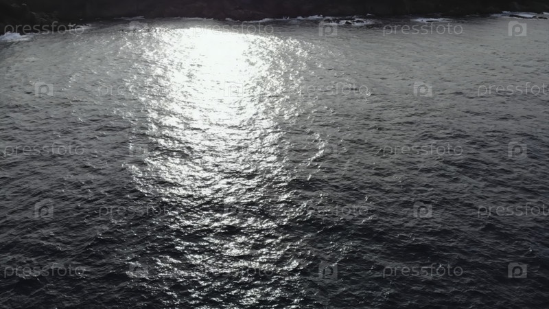 Вид с воздуха солнца, отражающегося на океанской воде вблизи скалистой береговой линии