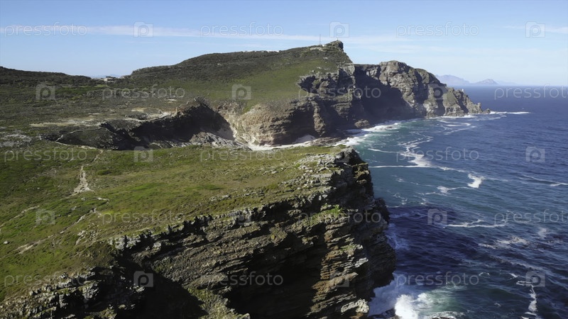 Солнечный свет освещает шероховатые береговые линии, светящийся мыс с видом на спокойные голубые воды и скалы