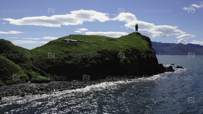 Маяк стоит на зеленом травянистом полуострове.Медиа
